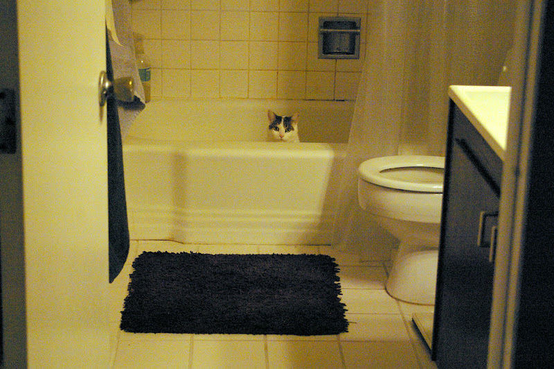 this morning when i walked upstairs to take a shower, i saw a little kitty face in an unusual spot. she was just sitting there, in the tub, looking at me. and i just had to take a picture. it just cracked me up too much.