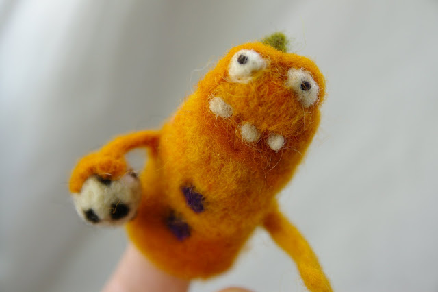 his name is “kicky” and he’s licky’s little brother. he likes to play soccer, but sometimes he plays a bit too rough (that’s why he’s missing some teeth). he’s got a spiky green ridge down his back and a bit of a unibrow. but i still think he’s pretty cute. actually, now that i’m looking at him, he looks a little bit like a simpson character, doesn’t he? sort of barney eyes, homer color and moe overbite. and what do you think–are the two purple spots double belly buttons? oddly symmetrical natural coloring? buttons on his otherwise invisible soccer uniform? so many questions for such a cute monster.