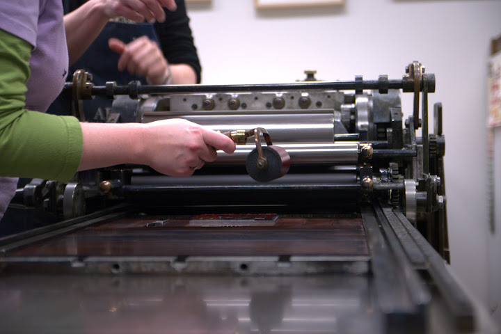 i love the printed samples they’ve got all over the room. the woman there gave us a wonderful quick introduction to how the pieces of type are loaded into trays, then showed us a few different presses. isn’t this one cute? hmmmmm…… wish list?
