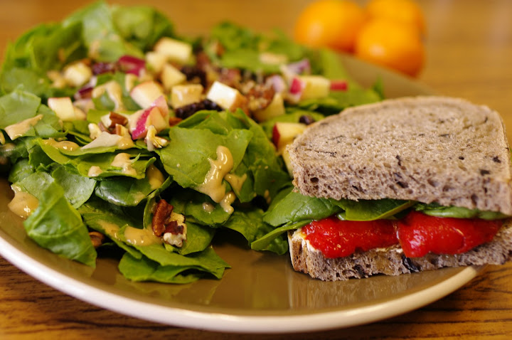 i just have to brag about the fantastic lunches i’ve had for the past two days. three days ago, after work i visited the la baguette bakery near my library. although it’s been there for over a year, i only recently discovered it and i hadn’t yet had a chance to try a loaf of their bread. so i went and bought some bread after work on tuesday. one of the loaves was an olive loaf that is filled with kalamata olives. for the past two days, i’ve made a sandwich using slices from that loaf, roasted red peppers, farmer’s market spinach and local, yummy goat cheese. today, i also added a salad featuring that same spinach plus apples, pecans, dried cherries, a tiny bit of red onion and annie’s goddess dressing. oh. my. goodness. super fantastic lunch made even better by the knowledge that i’d looked in my fridge that morning thinking i had nothing for lunch. wow. the clementines for dessert were just the exact right finish to the meal. oh, and yesterday’s home-canned peaches were also a nice snack. food can make me so happy–even more so when it’s somewhat healthy. this meal could actually be vegan very easily. all i’d need to do would be to substitute hummus for the goat cheese. also a yummy idea. hmmm… maybe tomorrow….