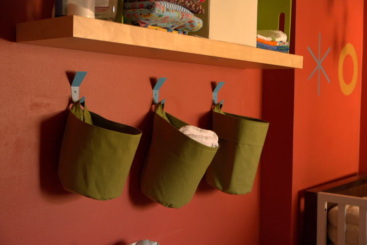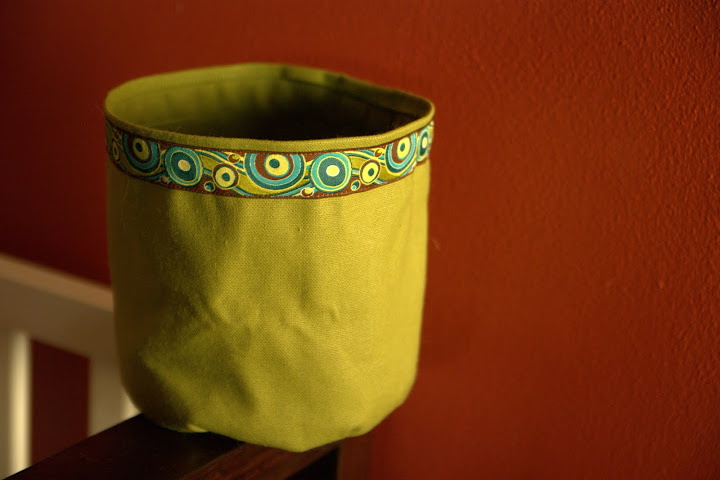 canvas buckets to hold diapering supplies and mini burp rags (see below) in the baby’s room. glad i finally found a good use for that awesome ribbon trim! the buckets in the first picture are still a little floppier than what i’d like–even with some plastic needlepoint “canvas” tucked into them to make the sides more stable–but so far they’re working fine.