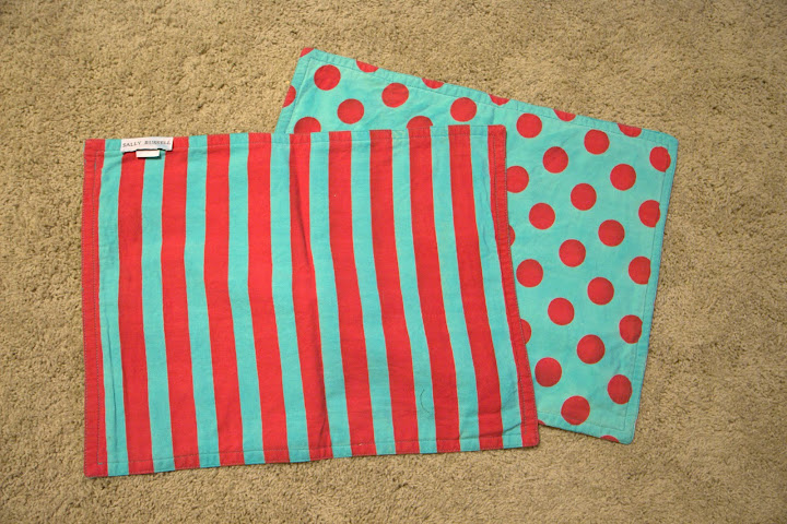 then, last for today, i was in the nursery the other day with the window open, enjoying the lovely spring breeze when that same breeze slammed to door shut very loudly. “hmmm….” i thought to myself, “that will never do. i need a doorstop.” and then i remembered rebekah’s challenge to make something from a book that we already own and luckily, i own lotta jansdotter’s simple sewing book which has a pattern for a doorstop that i’d been wanting to try. i rushed to my fabric stash and re-discovered these two reversible placemats i’d found at the dig-n-save last year sometime: