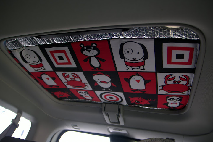 a sunshade for the sunroof on our honda element. (who the heck designs a sunroof with no options to shade it?? not even as accessories??) and i added some of that cute michael miller fabric to give the boy something fun to look at.