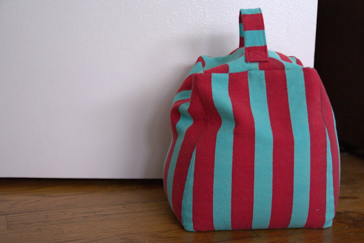 by the way, because i had cheap rice on hand and not a 5 lb bag of beans, i used rice. i wouldn’t recommend it. rice is much denser and more compact than beans, so my doorstop is quite heavy (too heavy for the handle maybe?) and still not filled all the way despite probably using 10 lbs of rice and an extra lb of beans!