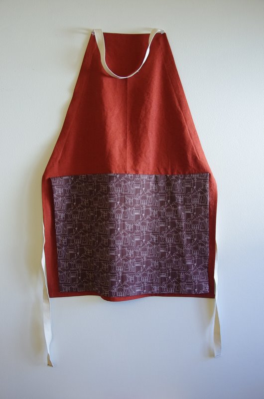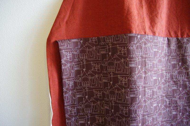 i just realized i never posted this birthday gift i made for my father. it was inspired by the dark brown fabric you see above. amber had it for sale in her shop and i knew i had to make something for my dad with it–it sort of looks like blueprints and some of the buildings look like churches, perfect! but what to make with only about a half yard of fabric? then i remembered this apron pattern from the purl bee and asked mom if dad needed a new apron by any chance. she said she that would be a good idea. i decided to try a slight change to the pattern. i’ve never seen him use a pocket on an apron, but he constantly wipes his hands on a towel or on the apron, so i thought i’d try sewing the featured fabric on to the apron as an attached “towel” of sorts. it’s just seamed at the top edge and the rest of the fabric is loose (i doubled the fabric over so it’s two layers thick and has no exposed raw edges).