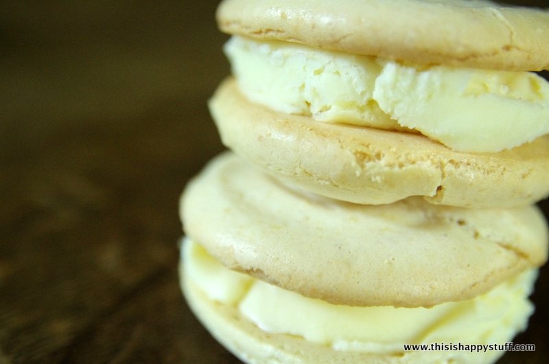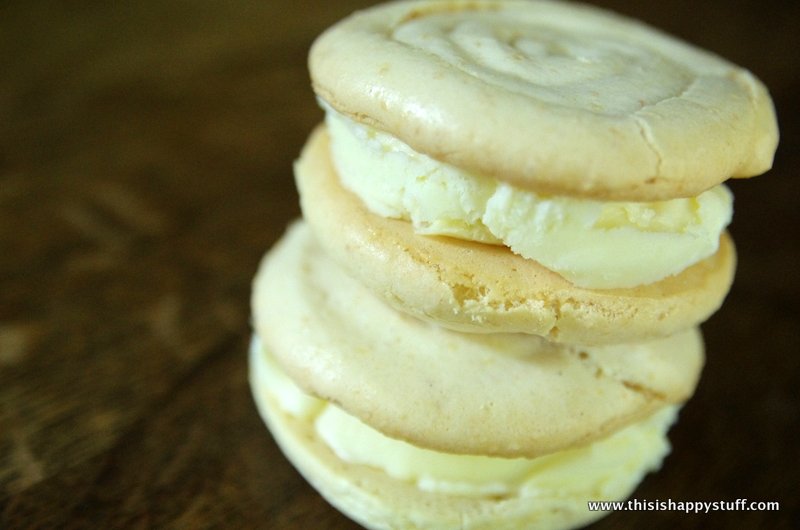 i also tried out the macaroon recipe. these aren’t like coconut macaroons, think french macarons, but simpler. i was a bit nervous about working with that many whipped egg whites and not accidentally over-whipping them, but it wasn’t actually that difficult (piping the swirls was fun!) and the cookies turned out great! i wouldn’t necessarily eat a bunch of them by themselves (they mostly taste like sugar, kind of like an ice cream cone), but they make a lovely handle for super rich ice cream (although you should not forget to factor in time to freeze them solid before packing ice cream onto them! the first ones i made got a bit smooshed). and this ice cream is super rich. creamy doesn’t really begin to describe it. sooooo smooth. looking forward to trying a second recipe!