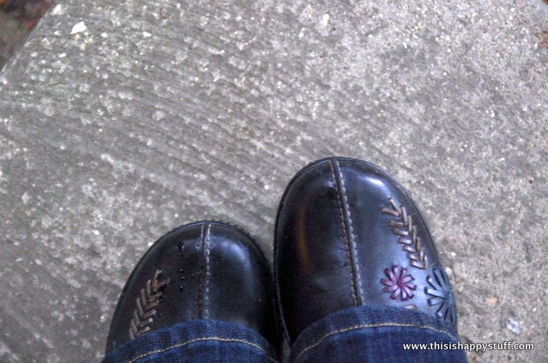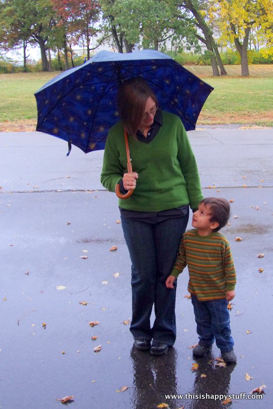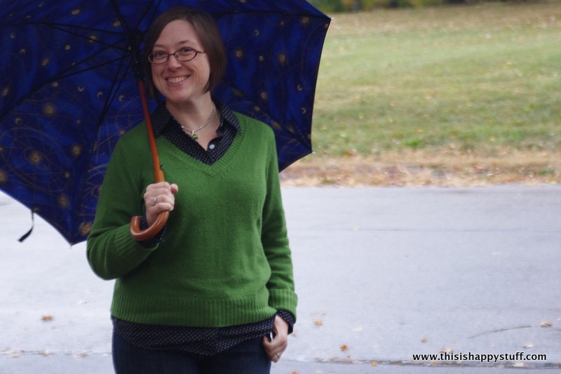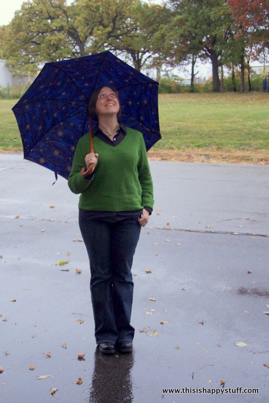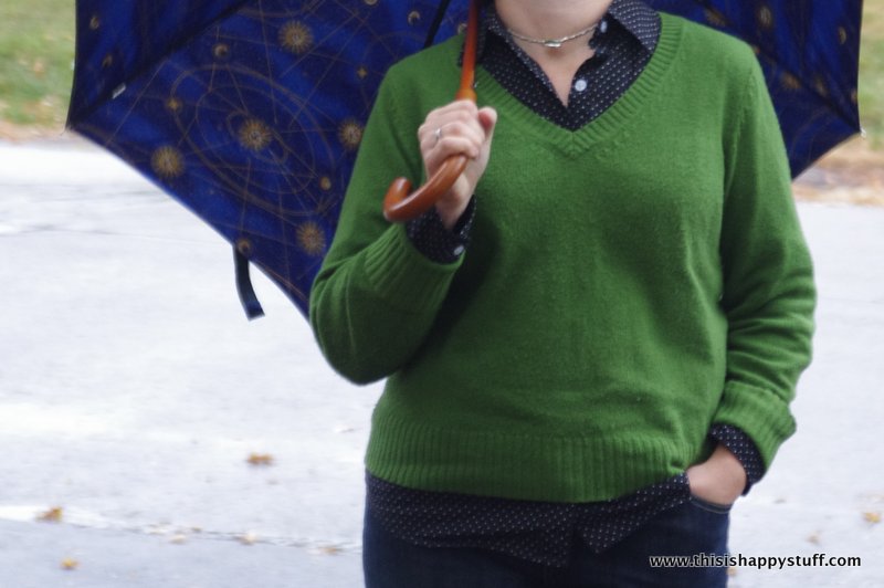 shirt:Â isaac mizrahi for target (thrifted) :: sweater: old navy (hand-me-downs from a friend) :: necklace (borrowed from a friend) ::Â jeans: the limited (hand-me-downs from a friend) :: shoes : clarks (thrifted) :: umbrella (found at tuesday morning years ago)