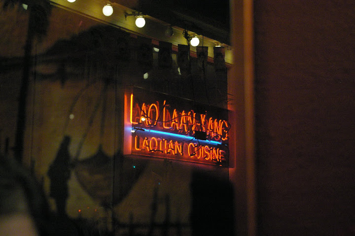 friends invited us out to a laotian restaurant for dinner tonight. i’ve never eaten laotian, but my friend told me that if i liked thai food and curry that i would like it and she was right! i got a vegetarian egg roll to start off with (bigger than the pork eggrolls, noted mr. happy stuff) which had the right kind of bubbly, crispy wrapper and was filled with bean sprouts, super skinny noodles and mushrooms. quite good!
