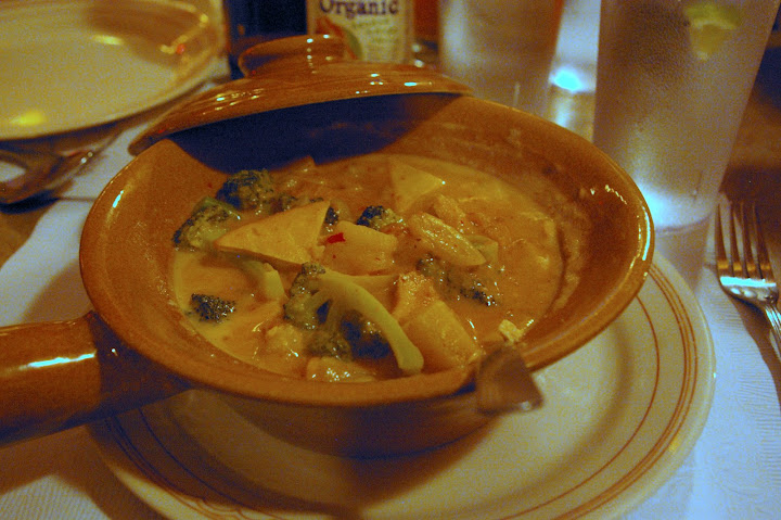 then i ordered pineapple curry for dinner. it was a peanut sauce based curry and in addition to pineapple, also included broccoli, potatoes, onion and tofu (i could have ordered a meat, but i decided to go with the tofu). very, very yummy. it came in these interesting bowls that sort of remind me of a cross between a bean crock and a tandoori oven–but probably for no good reason.