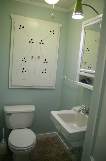 and we bought a light fixture, new faucet, new toilet seat, new flooring (the easy sticky vinyl tiles that sort of look like slate) and … a few other little things. as much as i wanted to do everything on my own as a gift to my parents, dad did have to help with a few things — replacing the light fixture, measuring where to lay the first tile, replacing the wax seal under the toilet, cutting a few of the trickier tiles, painting some of the more fiddly bits of trim (because he can do it a little more perfectly than i can) and helping with a special woodworking project. see, i decided that there were more attractive ways to vent a cabinet than leaving the doors open, so i sketched a few designs and had mom pick her favorite. then, dad drilled and jigsaw cut the doors according to my pattern (i did help with the project, but even dad was struggling with some of his power tools (his best tools were at the worksite), and i didn’t want to mess the doors up, so i just provided auxillary support where i could). All in all, we spent a little over two days (with generous breaks) and a little over $125 (which i helped to finance) and ended up with a bathroom that looks like this: