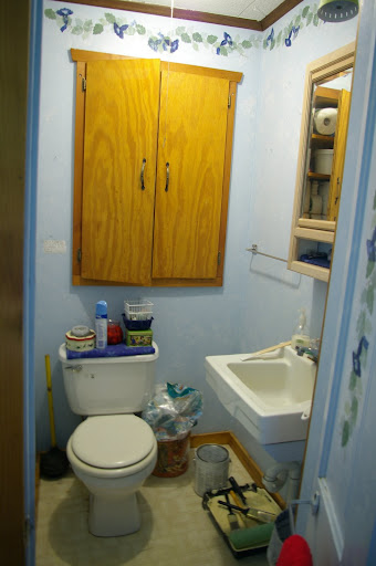 this picture doesn’t quite do it justice, really. can you see the sponge painting? from this far away, the morning glories look almost cheerful, but in reality, since the door was also covered in morning glories, when the door closed, it got rather claustrophobic. you can also see in the mirror’s reflection that the cabinet door on the back wall was partially open. mom said that she didn’t like to keep the doors closed all the time because she stores all of her cleaning supplies in there and the fumes got worse if the doors closed it all up. you also can’t see the bare bulb light “fixture” in the ceiling, but if you look closely, you can see the string they used for a light pull. when i took this “before” picture, i had also already removed mom’s ironing board that she stored on the wall beside the toilet when not in use. now, there is nothing really wrong with this bathroom. everything works. but i thought it could use a little updating.