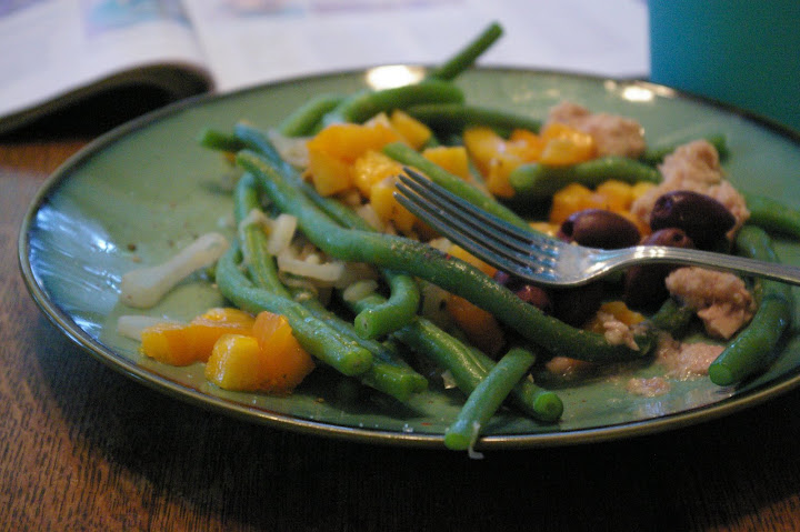 tonight for dinner, i decided to try out a recipe i’d seen on smitten kitchen a few days ago. last weekend, at the farmer’s market, one of the vendors was selling haricot vert (or is it haricots verts if there is more than one bean? i really know zero french, so please forgive me if my french grammar has issues) and beautiful heirloom tomatoes (must have a greenhouse–it’s waaaaay too early for tomatoes up here.). then, i saw this great recipe. it’s very simple. just some of these long french green beans, shallots, a little butter, salt, pepper and a squeeze lemon. i added a little canned tuna and a few olives to make it feel more like a meal and less like a side dish, but it would have been just fine without. the beans were so long–some were probably 8 or 9 inches! and smitten kitchen’s right about the cooking time. i boiled mine for 4 minutes (she recommends 3.5 but the timer on my oven doesn’t do fractions of minutes and i like my beans slightly over-cooked*) and they were perfect! really quite tasty. the lemon adds a really nice touch. the best part? since beans and tomatoes aren’t even truly in season yet, i have a long time to enjoy this dish all summer long.