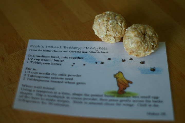 here are two of the p.b. balls i made today, sitting on top of a cute recipe card i made a few years back for a library program. the recipe i used called for p.b. (i used natural and it worked okay), honey, powdered milk and oatmeal. the recipe i made for the library program was a little less chunky, and i think i might like it better, so here’s that recipe (minus the instructions for how to make them look like honeybees–clue: use sliced almonds for wings):