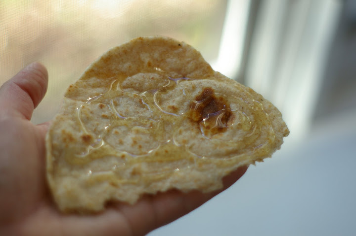 my other tortilla experiment this evening was honey on a tortilla for dessert. when i was a kid, similarly to the homesick texan, my family liked to eat at pancho’s. they had the best sopapillas. little puffy dough pillows, filled with air and not coated with that ridiculous powdered sugar that every other restaurant since them seems to feel obligated to use. you’d bite off a tiny corner and pour honey inside the pillow and then eat it, the soft dough soaking up the honey and dripping it out of the bottom corner, making your hands all sticky and sweet. (excuse me while i drool….) anyway, tonight’s honey-on-a-tortilla was very similar to the sopapillas from my childhood, only they weren’t puffy. but the taste was similar and i highly recommend it. yuuuuuuum.