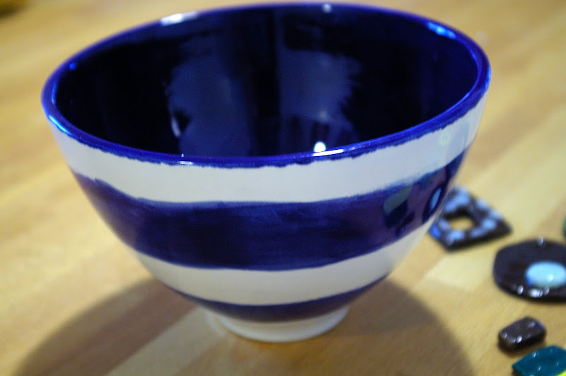 and last but not least, here’s the bowl that mr. happy stuff painted for me while he was waiting for me to finish glazing the pendants above. he picked out the bowl and painting it in my favorite blue and white stripes was completely his idea and i love it! what is it about blue and white striped pottery? swoon.