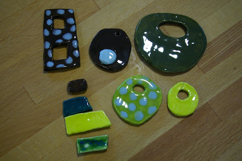 i also made some ceramic pendants. some worked better than others….  aren’t the polka dots cute?! i was inspired by bee designs (i own one of her necklaces) and making these few bits made me really appreciate her jewelry even more. hmmm… i just noticed how the top line of pieces in the photo above sort of looks like it spells “boo.” spooky.