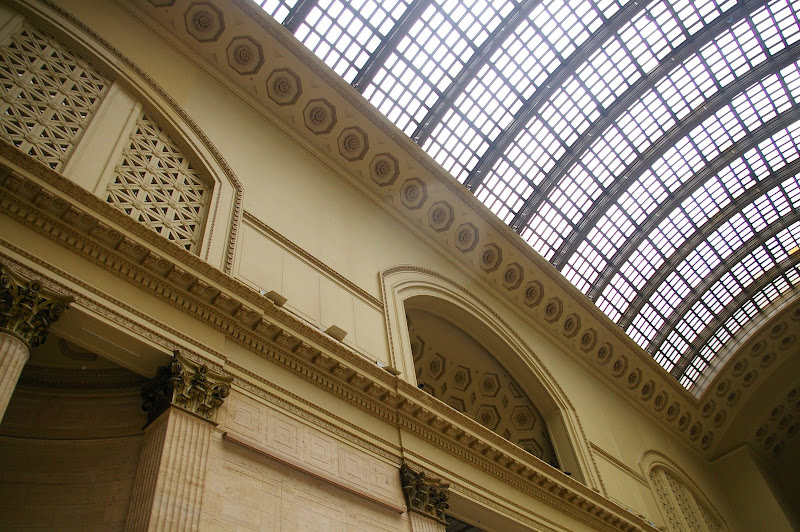 the photo at the top of this entry is from chicago’s union station. most of the train station is pretty depressing, standard mass transit fare–low ceilings, insufficient lighting, rushing crowds and cramped escalators. but then there’s this great hall with soaring ceilings and wooden benches like pews and a relative hush. granted, this is also the area where the unhoused take peaceful naps and hucksters ask you if you can spare a dollar or two so that they can buy a train ticket, but i still find the atmosphere so calming that i’d much rather hang out in this space than anywhere else in union station.