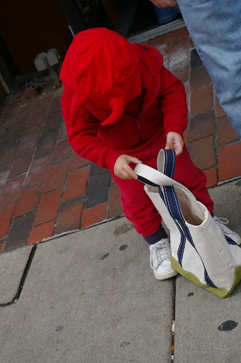 at first, he didn’t really know what was going on. he didn’t want to wear the horns and he didn’t want to carry his treat bag. after two stores, he was running ahead of his parents, bag in tow. although sometimes the handles got frustrating: