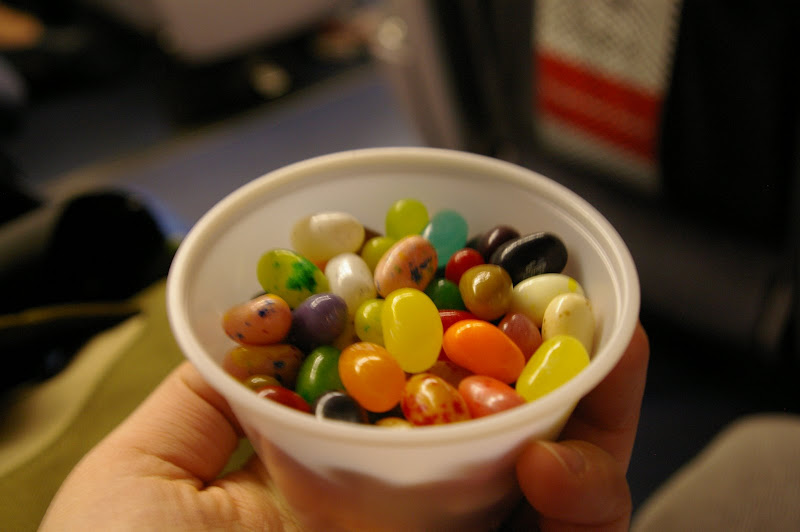 this tub of jelly bellys (only 89 cents!) lasted me all the way there and all the way home. it may become a travel tradition. i mean, i got that fuzzy teeth feeling, but the variety of flavors kept me from popping them all into my mouth in giant handfuls and kept my tastebuds entertained. my brain was kept entertained by reading the most recent popular vampire romance teen novel.